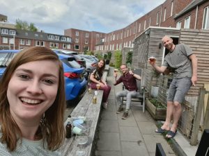 Papa ging een middagje gamen en mama ging aan de slag met een lakstift om de krasjes weg te werken die ze op de Tesla gemaakt had, oeps…. Toen de klus geklaard was even gezellig een biertje drinken met de buren, totdat het keihard begon te regenen!