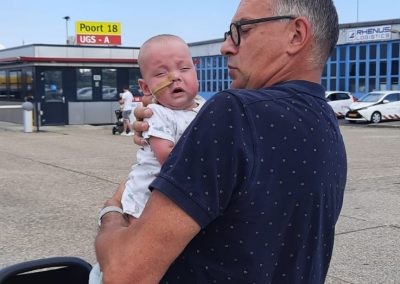 Papa had stiekem wel wat door, maar was super verrast toen daar ineens de opa’s en oma’s en ome Thijs op de stoep stonden! Uiteraard was er vlaai en nadat Thijs met een smoesje teruggereden was naar Den Haag om zijn paspoort op te halen (oepsie) kwam de verrassing boven tafel – een pilotenpet op en op naar het vliegveld, wat zouden we daar nu gaan doen…. Eenmaal bij het vliegveld waren daar ook Pim, Margriet en mijn nichtje Sophie. Wat leuk! Samen hebben we papa en Thijs uitgezwaaid, goede reis!!! Eigenlijk zou Jan-Willem meegaan, maar zijn kindjes Evy en Tim hadden flinke koorts dus dat durfde mama niet aan omdat ze bang was dat ik misschien ziek word. Dat was jammer, maar wel lief dat mama zo goed op me past.