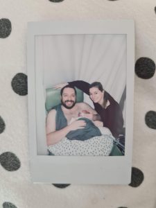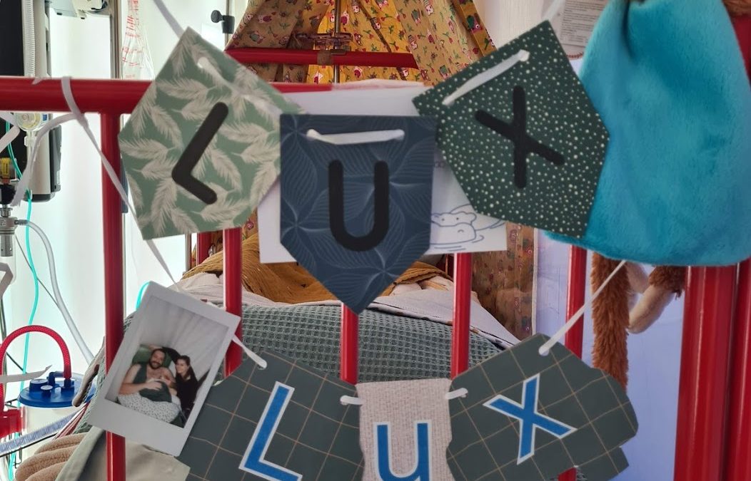 ‘S nachts werd ik erg onrustig van dat kapje op mijn neus en hebben ze me toch weer een neusbril gegeven, maar nog een standje hoger – flow 8. Papa en mama kwamen ‘s ochtends weer en ik mocht even met papa gaan knuffelen, terwijl ik bij hem lag kon de flow 1 standje omlaag en de zuurstof rustig wat worden afgebouwd. Jiske heeft nog een mooie foto gemaakt van ons gezinnetje, die hebben we aan mijn naamslinger gehangen. Dat hebben we afgekeken van een van de buurkindjes die ook een foto van papa en mama aan het bed heeft, ziet er gezellig uit.