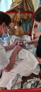 Woensdag waren papa en mama weer gezellig bij mij. Papa haalde me uit bed en voelde toen wat nattigheid, ik had net ervoor gespuugd. Toen ik bij mama lag en papa mijn bedje verschoonde met nieuwe lakentjes werd ik heel erg onrustig. Ik kreeg niet genoeg lucht en probeerde dat duidelijk te maken aan papa en mama, die gelukkig goed opletten en de zusters vroegen om eens mee te kijken. Natuurlijk gingen de bliepjes van de monitor ook af. De zusters kwamen kijken en gingen me helpen door de zuurstof wat omhoog te zetten. Na een tijdje proberen en omhoog zetten besloot een van de zusters om me uit te zuigen, misschien zat er door het spugen wat voeding in mijn neus. Mama legde me eventjes terug in bed en na het uitzuigen ging het een stuk beter dus ging ik weer lekker bij mama liggen. Toen heb ik even een halfuur lekker geslapen, maar daarna werd ik weer heel onrustig. Het was ook heel druk op zaal, er werden verschillende kindjes binnengebracht en er moest heel veel gebeuren. De zuster kwam weer kijken en ook de dokter kwam even langs. Met nog meer zuurstof en de flow een standje hoger kwam ik weer een beetje op adem, maar ze wilden toch goed testen wat er nou aan de hand was. Ze hebben bloed geprikt en een röntgenfoto gemaakt, op de foto zagen ze behalve het BPD beeld niets geks, maar aan mijn bloed zagen ze dat ik erg moe ben. Daarom wilden ze me helpen en me terug aan de CPAP leggen qua ademondersteuning, in het Sophia werkte dat met de “lange sprieten”, maar hier in het SFG werkt het met een kapje en een mutsje om het op zijn plek te houden. Het geeft meer druk dan de neusbril en zorgt ervoor dat ik makkelijker kan ademen. Papa en mama hebben wel een foto van me gemaakt maar ik vind het niet zo’n knappe foto dus die houd ik even voor mezelf! Papa en mama zijn de hele tijd bij me gebleven en alleen even weggegaan om te eten. Zo lief zijn ze voor mij, het hielp me om een beetje rustig te worden en te gaan slapen.