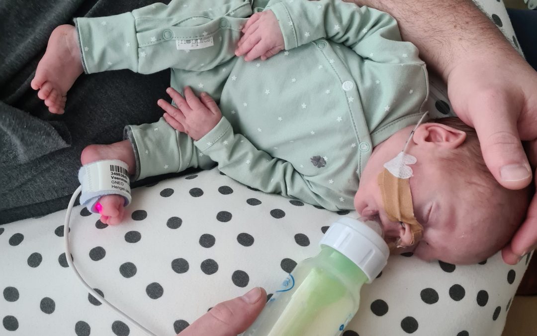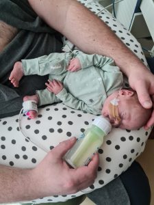 Zondagochtend belde de zuster naar papa, het lijkt alsof ik een paar slokjes wil drinken, mag ze proberen me een flesje te geven of zijn papa en mama er bijna? Papa en mama waren net onderweg, maar natuurlijk mocht de zuster het alvast proberen! Ik lag alweer lekker op schoot een beetje bij te komen van het oefenen en mocht toen lekker bij mama liggen.
