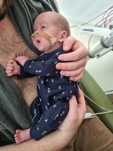 Vanochtend belde mama meteen om te vragen hoe de nacht was geweest, vorige keer kreeg ik de dag na het bezoek van de oogarts een dipje, hopelijk is het nu ok! De zuster vertelde dat het goed met me ging, mama was erg opgelucht. Vandaag ben ik 8 weken oud, weer een nieuwe mijlpaal! Papa moest ‘s morgens werken en mama kreeg gezellig visite van Inge. Na de lunch kwamen papa en mama bij mij. Ik had van de zuster al een schoon pak gekregen (van oma gekregen!) en mijn flow was inmiddels afgebouwd naar 0.4 liter. Ik lag lekker bij papa toen de fysiotherapeute nog even kwam praten over wat ze voor ons kon betekenen als ik straks naar huis ga. Er komt, afhankelijk van hoe het met me gaat, ongeveer 1x per maand of vaker een fysiotherapeute bij ons thuis om goed naar me te kijken en me te helpen met mijn ontwikkeling. Fijn he?!