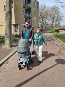 Dingdong, daar ging de bel, en daar waren Jan-Willem, Esther, Evy en Tim om even naar mij te zwaaien en een badje te komen brengen dat ik mag lenen. Papa vond het wel een goed idee om even een stukje te wandelen, en daar gingen we. Evy heeft samen met papa mijn wagen geduwd, heel gezellig!