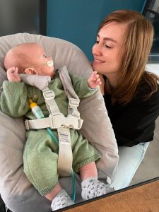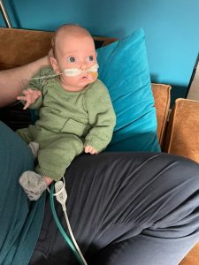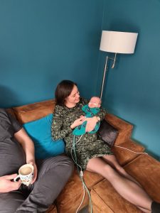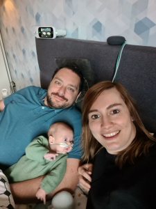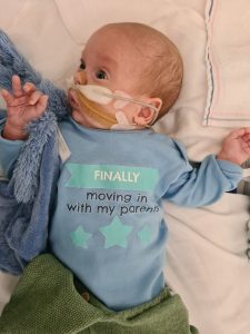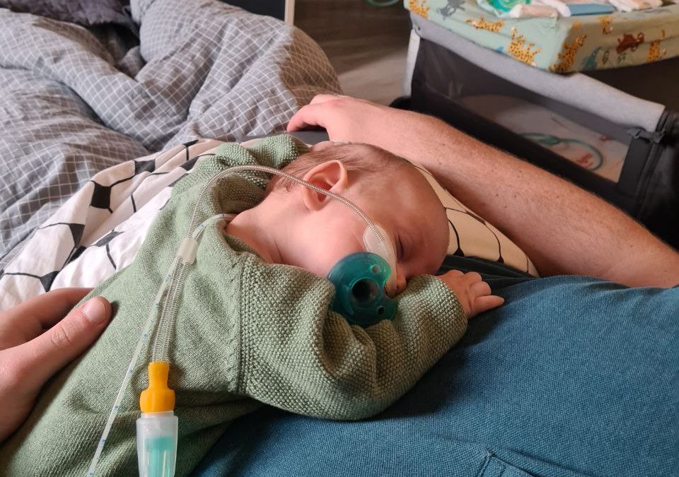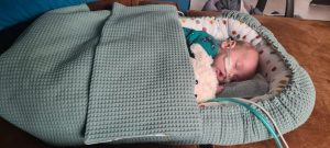 Ik heb nog lekker gerelaxed met papa en mama, maar toen zij de spulletjes aan het pakken waren om terug naar het ziekenhuis te gaan, kreeg ik flink buikpijn en ik zette het op een gillen. Ik was een uur lang ontroostbaar, dikke tranen (voor het eerst!) en mijn hartslag ging flink tekeer. Ook zakte mijn saturatie eventjes, heel kort maar, maar papa draaide de zuurstof voor de zekerheid naar 1,5 liter. Na een uur rondjes hupsen, en in 100 verschillende houdingen mij gerust proberen te stellen, kalmeerde ik een beetje. Hehe, die krampjes waren eindelijk over……! Toen mocht ik in de auto mee en brachten papa en mama mij weer terug. Natuurlijk hadden papa en mama me liever nog even thuis gehouden, maar het gelukkige gevoel dat ik een heel weekend bij ze was geweest overheerste! Dat had ik ook, wat een heerlijk weekend was dit!