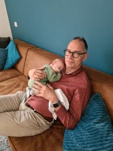 Zie je me zwaaien? Hoi huis, dit is mijn thuis! En wat mooi is het hier! Ik lag nog niet in de box en daar ging de bel, opa en oma Vlaai kwamen mij bewonderen. Ik ging lekker met opa knuffelen terwijl papa en mama rustig alle spulletjes uitpakten en alles op een logische plek neerlegden.